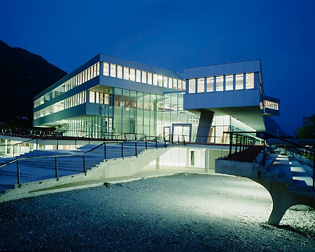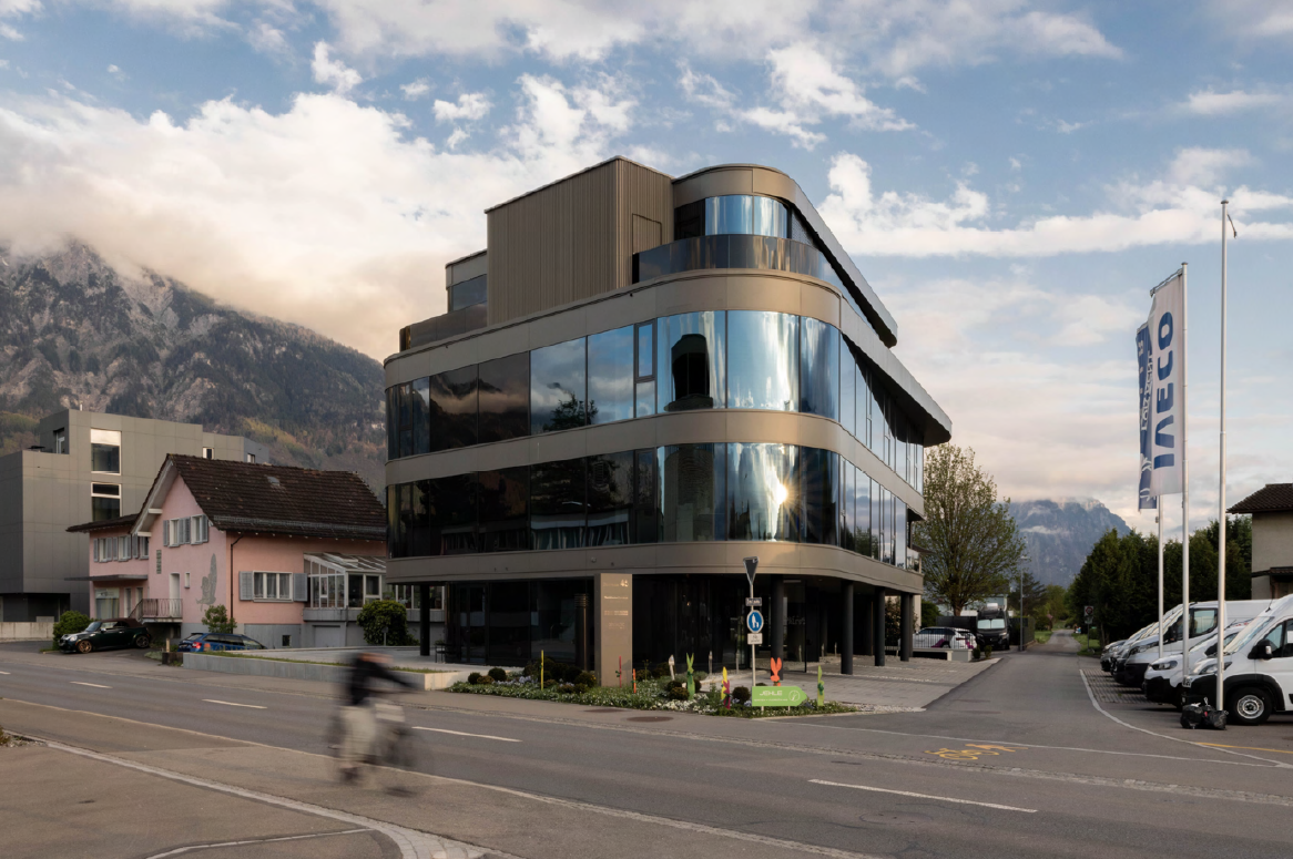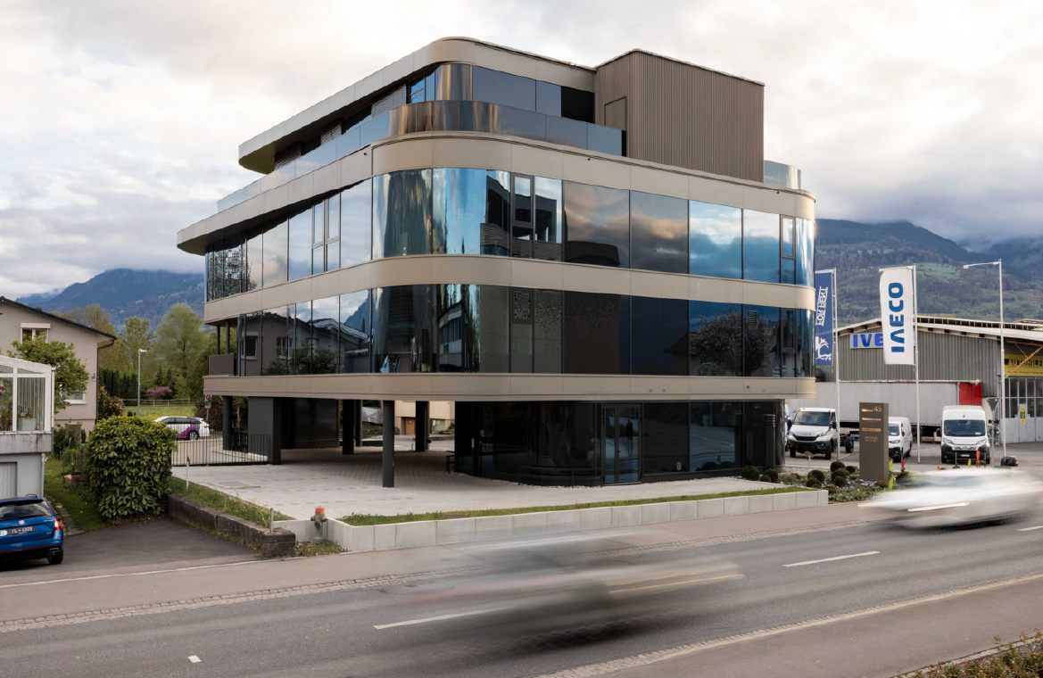 Glasfassaden aus Pfosten-Riegel-Konstruktionen kombiniert mit innovativen Glaselementen betreffend Sonnen-+ Wärmeschutz.